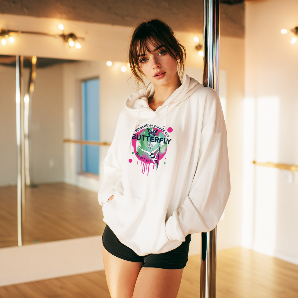 Este hoodie de pole dance Butterfly combina abrigo, comodidad y personalidad, perfecto para antes o después del entrenamiento o para el día a día con actitud poler.